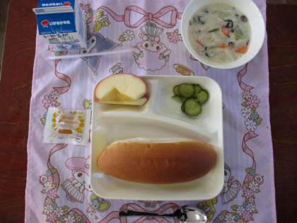 ♦きのこのクリームシチュー♦きゅうりのバジル風味サラダ♦りんご♦コッペパン(添加物:マーマレード)♦牛乳