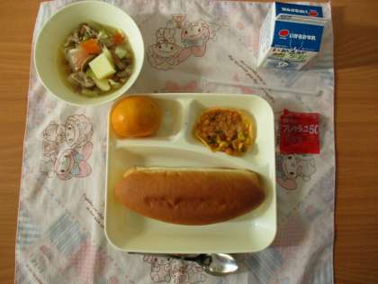 ♦豚肉と野菜のスープ煮♦変わりピザ♦みかん♦コッペパン(添加物:いちごジャム)♦牛乳