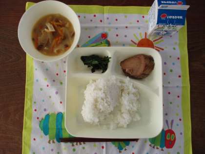 ♦なまりぶしのしょうが煮♦なめこのみそ汁♦ほうれんそうのごまあえ♦ごはん♦牛乳