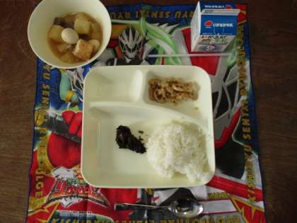 ♦関東煮♦れんこんの梅風味焼き♦のりのつくだ煮♦ごはん♦牛乳