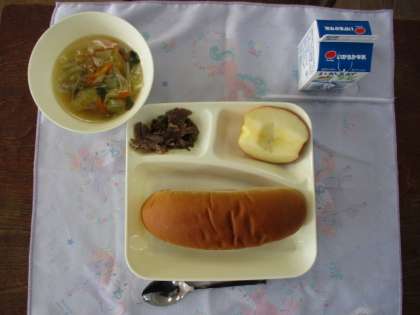 ♦牛肉のオイスターソース焼き♦中華スープ♦りんご♦こくとうパン♦牛乳