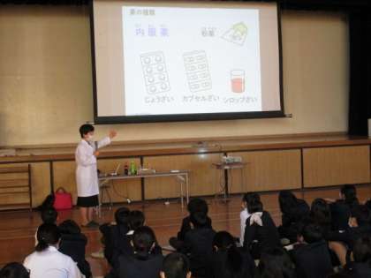 12月2日(木)6時間目に講堂で、本校薬剤師の西川節子先生による「薬の正しい使い方について」の学習を行いました。