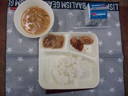 ♦鶏肉の甘辛焼き♦みそ汁♦だいこんの煮もの♦ごはん♦牛乳