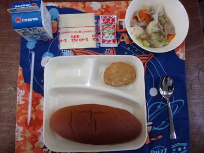 ♦とうふハンバーグ♦カリフラワーのスープ煮♦スライスチーズ♦こくとうパン♦牛乳