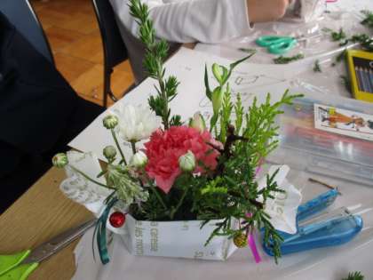 1時間の授業ででき上がり、「フラワーケーキ」として家に持ち帰ることができるので、子どもたちは大喜びでした。