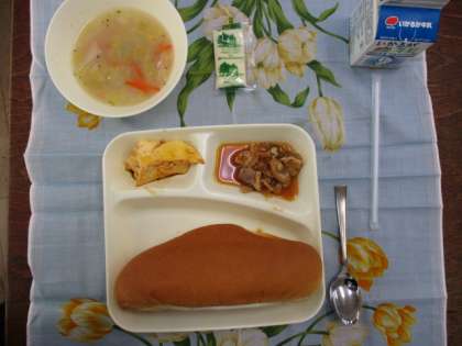 ♦豚肉のケチャップソテー♦コーンスープ♦焼きプリン♦コッペパン(添加物:ソフトマーガリン)♦牛乳