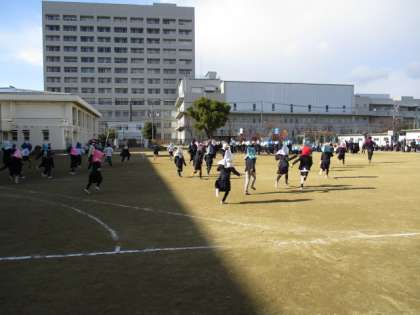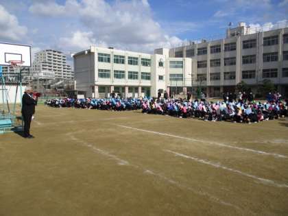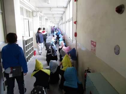 地震を想定して、揺れがおさまるまで机の下に入る訓練と防災頭巾等で頭を守りながら運動場に避難する訓練を行い、運動場に全員が避難完了し安全が確認された後、大きな地震のため津波警報が発令されているという想定で、校舎の3階以上に再度避難する訓練を行いました。