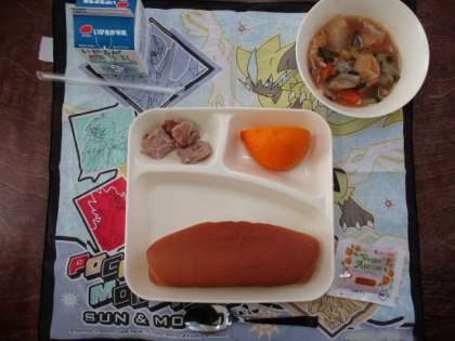 ♦豚肉のオイスターソース焼き♦あつあげとだいこんの中華煮♦デコポン♦コッペパン(添加物:アプリコットジャム)♦牛乳