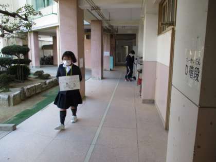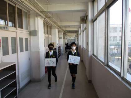 児童会の子どもたちが休み時間に階段や廊下を歩いて、みんなに「廊下を走らないこと」「右側通行で安全に歩行すること」や、「密にならないように」などを呼びかけました。