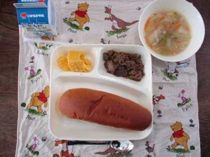 ♦牛肉のデミグラスソース煮♦コーンスープ♦かぼちゃのプリン♦こくとうパン♦牛乳