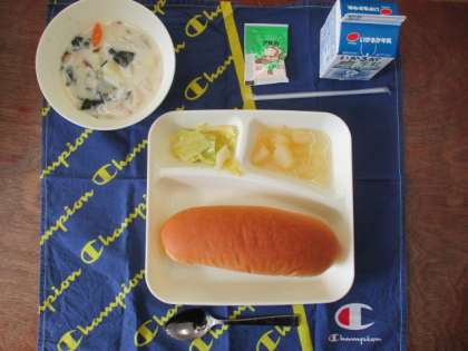 ♦ほうれんそうのクリームシチュー♦キャベツのサラダ♦洋なし(カット缶)♦コッペパン(添加物:ソフトマーガリン)♦牛乳