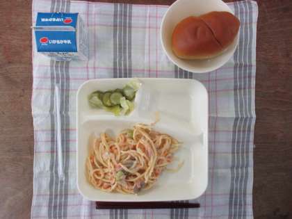 ♦さけのクリームスパゲティ♦キャベツときゅうりのサラダ♦こくとうパン(小)♦牛乳