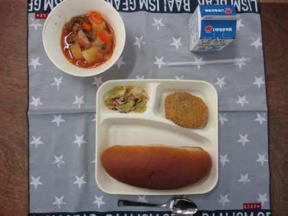 ♦チキンレバーカツ♦ケチャップ煮♦たことキャベツのバジルソテー♦こくとうパン♦牛乳