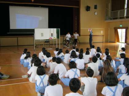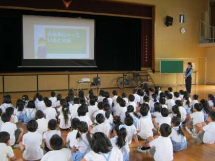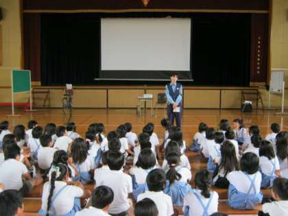 6月3日、2・4・6年生の交通安全教室がありました。住吉警察のおまわりさんに来ていただき、自転車の乗り方についてのお話を聞きました。「こんなに静かに一生懸命お話が聞ける学校は、初めてです」とほめていただきました。