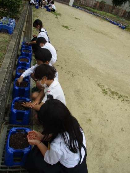 1年生は、朝顔を育てる準備です。植木鉢に土を入れています。