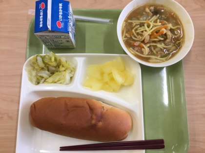 カレースープスパゲッティ、キャベツのピクルス、りんごです。