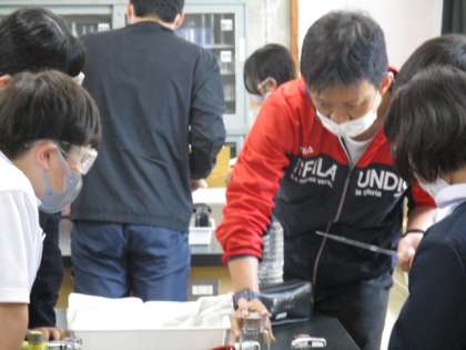 火の消えたろうそくを、ふたを少しずらして取り出し、びんの中の空気の成分を、石灰水と気体検知管を使って調べています。