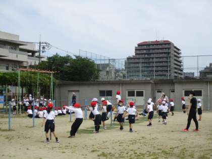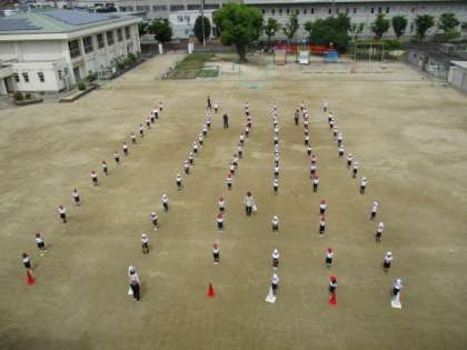 1年生のようすです。並び方の練習をしたり、遊具を使っての運動をしたりしています。