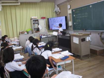 3年生は、ノートに書いた自分の考えを大型画面に映して、説明をしていました。