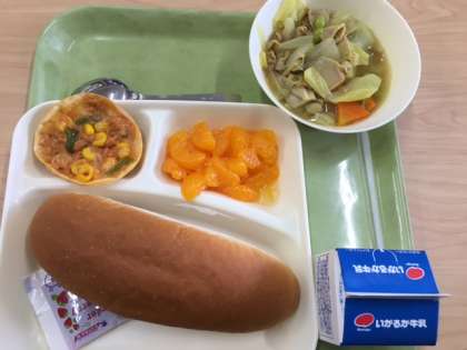 豚肉と野菜のカレースープ煮、変わりピザ、みかんです。