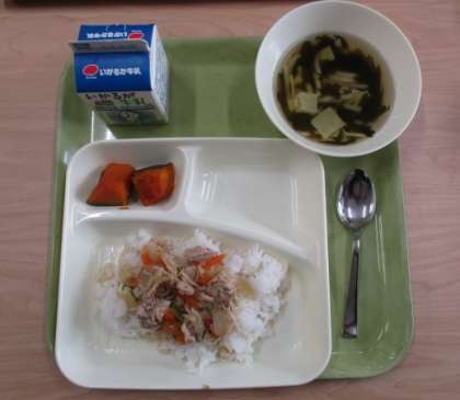 ぶたどんぶり・ゆばのすましじる・かぼちゃのしょうゆやき・ごはん・ぎゅうにゅうです。