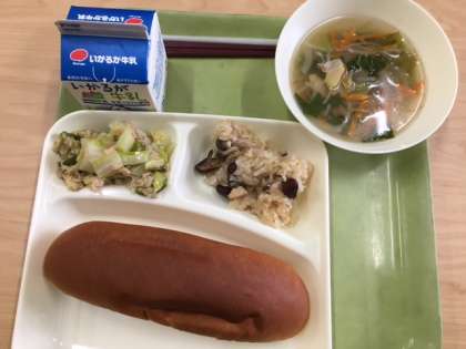 金時豆の中華おこわ、中華スープ、ツナと野菜のオイスターソースいためです。