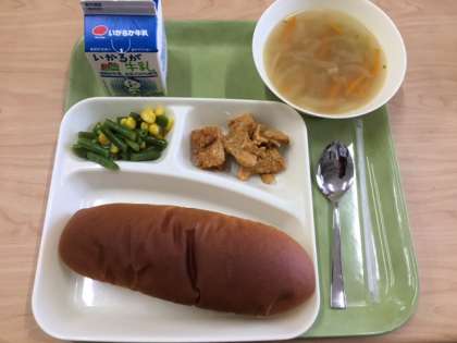 鶏肉のカレーマヨネーズ焼き、てぼ豆のスープ、さんどまめとコーンのサラダです。