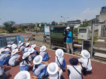 急速砂ろ過池。模型を使って仕組みの説明です。後でろ過の実験もあるようです。