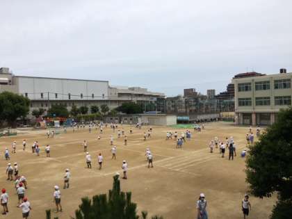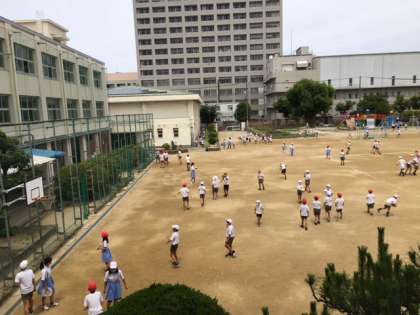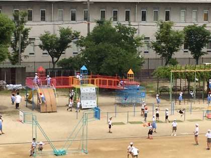 たくさんの子どもたちが運動場で遊んでいます。