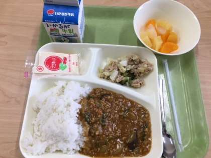 夏野菜のキーマカレーライス、ゴーヤとツナのマヨネーズ風味、ミックスフルーツです。