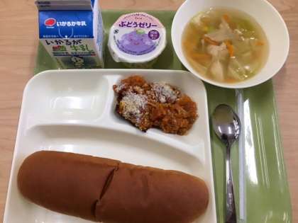 かぼちゃのミートグラタン、スープ、ぶどうゼリーです。