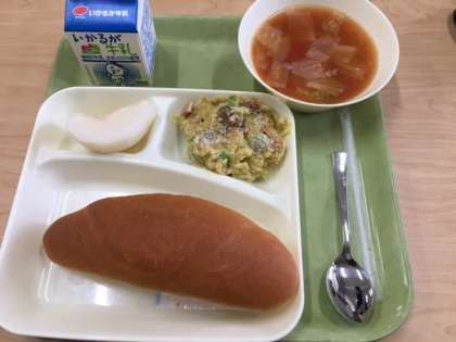 豆乳マカロニグラタン、トマトスープ、なし(二十世紀)です。
