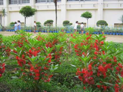 7月6日、ホウセンカが満開です。その向こうでは1年生はアサガオに2年生はミニトマトに水やりをしています。