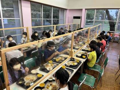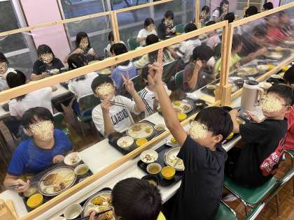 「晩御飯を食べています。みんな、美味しい美味しいと言い、たくさん食べています。」