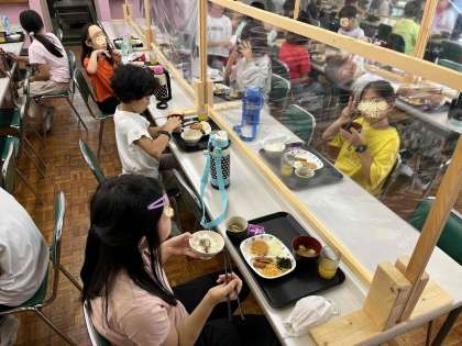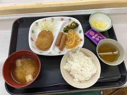 「朝食を、食べています。おいしいといって、もりもり食べております。」