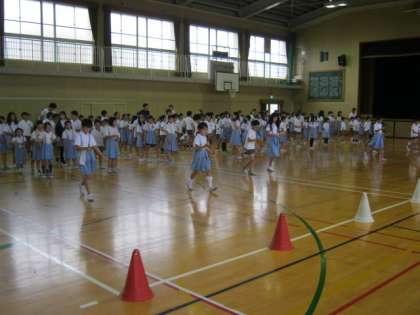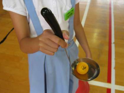 7月9日の児童集会は、各学年の2組が講堂に集まって「ピンポン玉をはこべ!」ゲームをしました。たてわり班でお玉にのせたピンポン玉を落とさないようにリレーします。異なる学年で楽しく協力できました。