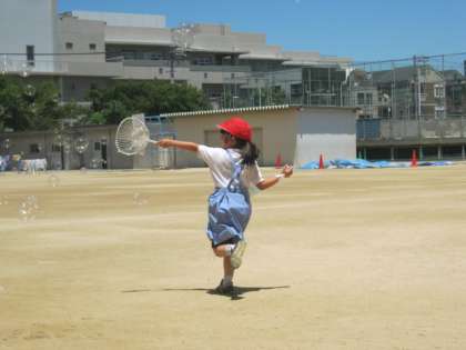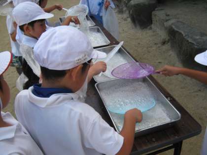 7月14日、1年生は生活科「水であそぼう」の授業でシャボン玉遊びをしました。うちわの骨やストローを使って大きなシャボン玉を作りました。