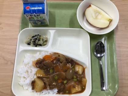 ハヤシライス(米粉)、キャベツのひじきドレッシング、りんごです。