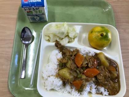 ポークカレーライス[米粉]、サワーキャベツ、みかんです。