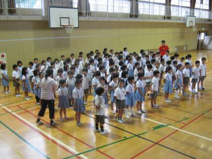 7月17日1時間目。2年生は講堂に集まって「平和学習登校日」の練習をしていました。