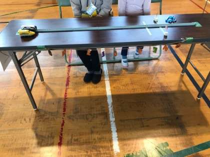 これは、プラレールの電車を手で押して、線のところで止められたら成功なのかな?