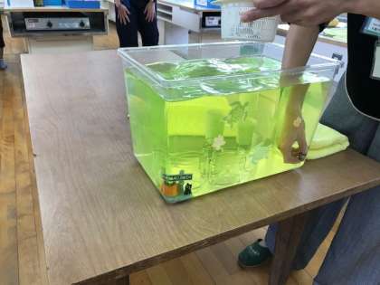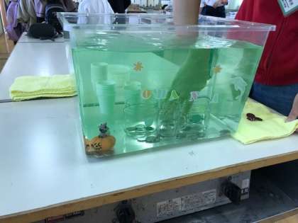 水槽の中のコップに、じょうずにコインを入れることができたらOK!!