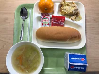 ツナポテトオムレツ、豚肉とキャベツのスープ、みかんです。