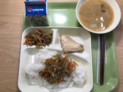あかうおのしょうゆだれかけ、なめこのみそ汁、きんぴらごぼうです。