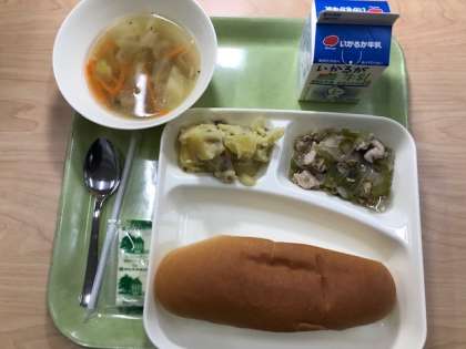豚肉と野菜のソテー、スープ、スイートポテトです。