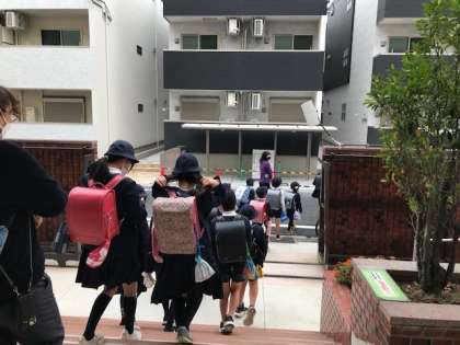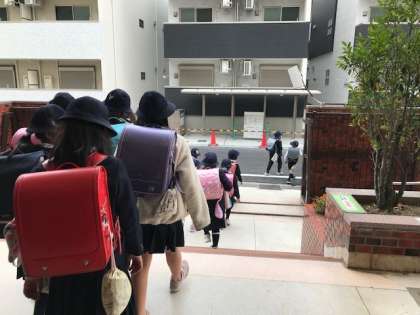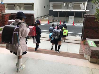 集団下校のようすです。先頭と後ろは高学年の子どもたちです。