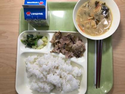 豚肉のごまだれ焼き、みそ汁、きくなとはくさいのおひたしです。
