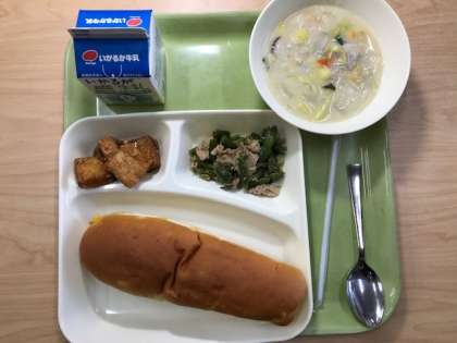 はくさいのクリーム煮、あつあげのごまじょうゆかけ、豚肉とさんどまめのオイスターソースいためです。