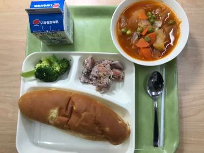 鶏肉のバジル焼き、ウインナーと野菜のケチャップ煮、ブロッコリーのサラダです。