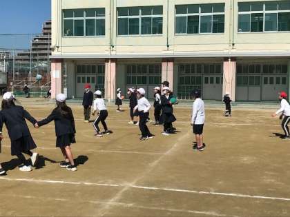 先生方も運動場に子どもたちのようすを見にこられています。
